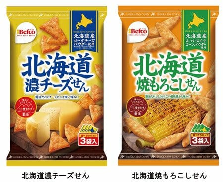 「北海道濃チーズせん」には北海道産ゴーダチーズパウダー、「北海道焼もろこしせん」には北海道産スーパースイートコーンパウダーを使用。