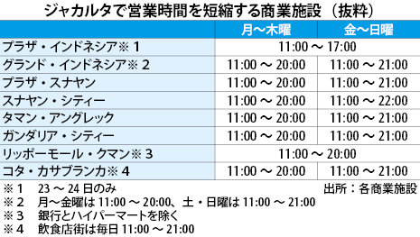インドネシアの首都ジャカルタで商業施設が相次いで営業時間を短縮している。中心部の高級ショッピングモール「プラザ・インドネシア」は23日、同日と24日の2日間、営業時間を午前11時~午後5時までに短縮すると明らかにした。ジャカルタ特別州のアニス知事が20日、州内の企業に対して、従業員を在宅勤務させるよう呼び掛けたのを受けた措置とみられる。