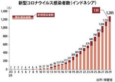 インドネシア国内の感染者数は29日正午までに累計で1,285人、死者は114人となった。感染地域も日に日に広がっており、同日には全国34州のうち30州で感染者が確認された。