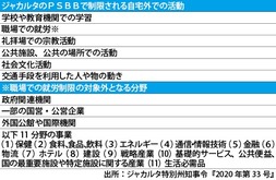 自宅外の活動については、▽学校や教育機関での学習▽職場での就労▽礼拝場での宗教活動▽公共施設、公共の場所での活動▽社会文化活動▽交通手段を利用した人や物の動き――を制限する。これにより、職場での就労は一部を除いて原則的に禁止される。