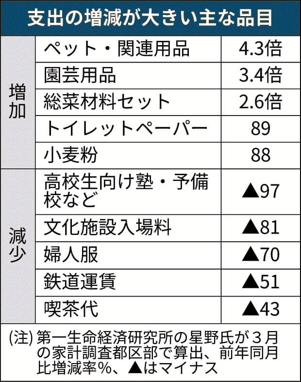 ペット関連4.3倍、園芸用品3.4倍――。新型コロナウイルス感染拡大による外出自粛で、前年に比べて自宅での趣味などに関する支出が急増している。3月の東京都区部の家計調査では、ペットなどのほか、内食向けの食品や生活用品など幅広い品目で支出を増やす家計の姿が浮かび上がった。