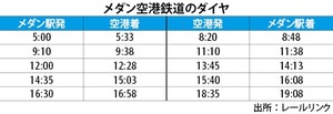 1日の運行本数は5往復。メダン駅からクアラナム空港行きの始発電車は午前5時、最終電車は午後4時30分に出発する。空港からメダン駅行きの始発は午前8時20分、最終電車は午後6時35分に出発する。
