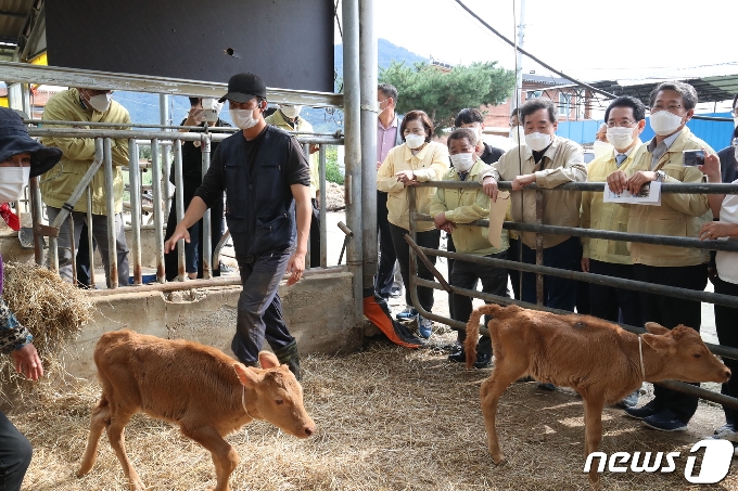 (구례=뉴스1) 황희규 기자 = 이낙연 더불어민주당 대표가 19일 오후 전남 구례군 양정마을을 찾아 호우피해를 입은 한우사육농가에서 당시 구출된 소에서 태어난 쌍둥이 송아지를 바라보고 있다. 2020.9.19/뉴스1
