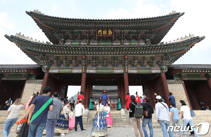 (서울=뉴스1) 송원영 기자 = 민족대명절 추석인 1일 오후 서울 종로구 경복궁을 찾은 시민들과 외국인들이 궁내를 돌아보며 휴일을 즐기고 있다. 2020.10.1/뉴스1