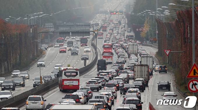 (서울=뉴스1) 임세영 기자 = 막바지 단풍 인파로 붐빈 1일 오후 서울 서초구 잠원IC 인근 경부고속도로가 차량들로 정체현상을 보이고 있다. 한국도로공사에 따르면 이날 전국 고속도로 이용 차량이 418만대 정도일 것으로 분석된다. 서울로 향하는 상행선의 정체는 오전 11~12시쯤 시작돼 오후 5시~6시쯤 절정에 달했다가 오후 10시~11시에 해소될 것으로 내다봤다. 2020.11.1/뉴스1