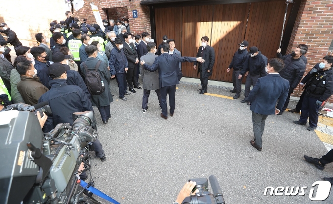 (서울=뉴스1) 안은나 기자 = 장제원, 권성동 국민의힘 의원, 조해진, 김문수, 이은재 전 의원 등이 2일 오후 서울 강남구 논현동 이명박 전 대통령 자택 앞에서 이 전 대통령을 배웅하기 위해 기다리고 있다. 자동차 부품업체 다스(DAS)의 자금 수백억원을 횡령하고 삼성에서 거액의 뇌물을 받은 혐의로 기소돼 징역 17년형이 최종 확정된 이 전 대통령은 이날 동부구치소에 재수감될 예정이다. 2020.11.2/뉴스1