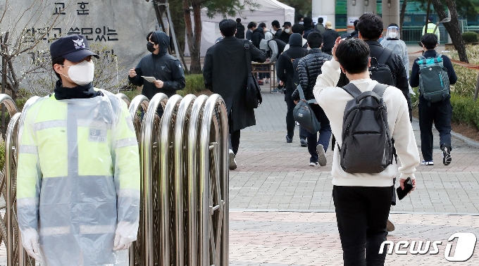 (서울=뉴스1) 김진환 기자 = 2021년 1차 경찰공무원(순경) 채용 필기시험이 치러진 6일 오전 서울 중구 성동공업고등학교 고사장으로 응시생들이 들어가고 있다. 경찰청에 따르면 이번 시험에는 2907명 선발 예정에 4만6687명이 응시해 16대 1의 경쟁률을 기록했다. 2021.3.6/뉴스1