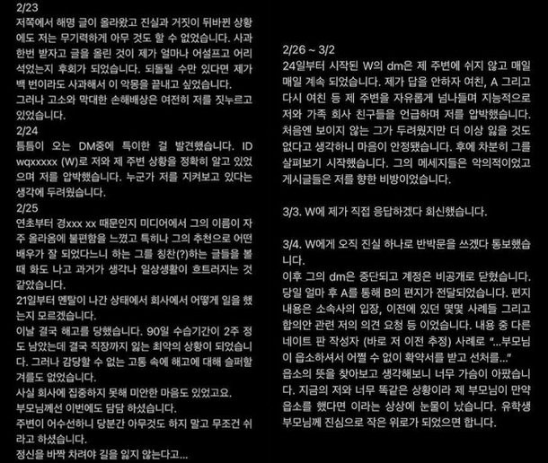 또한 DM을 통해 꾸준히 자신을 압박해온 제 3의 인물이 있음을 주장했는데요. A씨는 "24일부터 W는 제 주변에 쉬지 않고 DM을 보냈다. 내가 답을 안 하자 여친, 동창 등 주변을 넘나들며 가족, 회사 친구들까지 언급하며 나를 압박했다. 그의 메시지는 악의적이고 나를 향한 비방이었다"고 전했습니다.