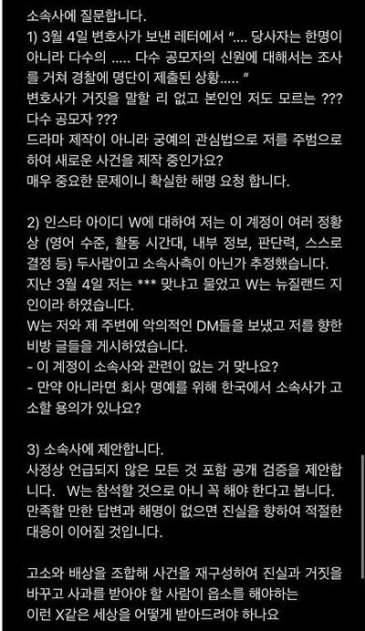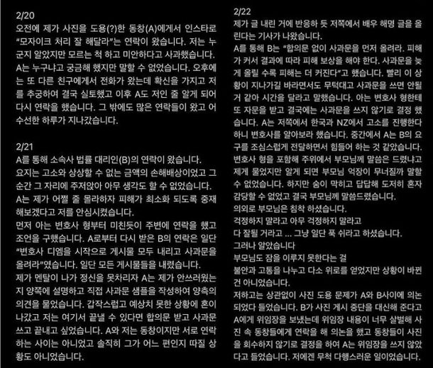 이어 "소속사의 입장, 이전 사례들 그리고 합의안 관련 의견 요청 등이 담긴 편지가 전달됐다"며 "내용 중 다른 네이트 판 작성자(바로 나 이전 추정) 사례로 '부모님이 읍소하셔서 어쩔수 없이 확약서를 받고 선처를…' 내용이 너무 가슴이 아팠다. 지금의 나와 너무 똑같은 상황"이라고 언급하기도 했는데요.
