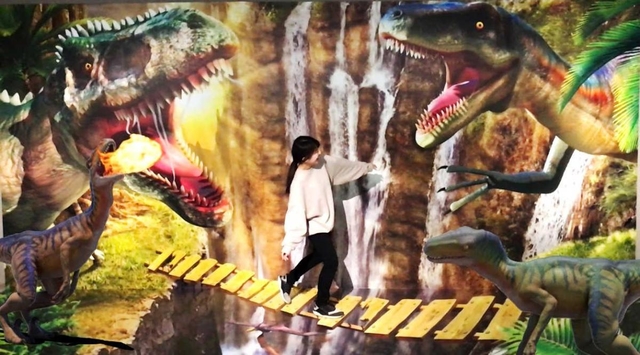 同館は旧滝野庁舎を改修し1階がメイン会場となる。壁には恐竜、キングコングなどの迫力ある巨大なアート作品を展示。絵の前に人が立ちスマホやカメラを向けると、人がその世界に入り込んだような立体的な光景を撮影することができる。