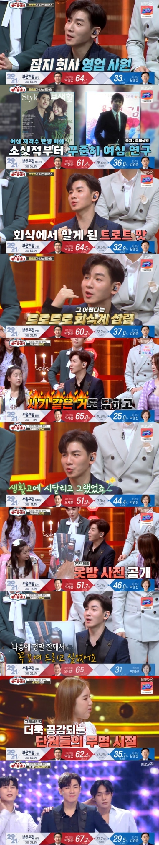 한강은 트로트 가수가 되기 전, '주부생활' 잡지 영업사원으로 근무했다고 고백해 눈길을 끌었다. 이어 한강은 "막내다 보니 회식 자리에서 분위기를 띄우기 위해 트로트를 많이 불렀다. 부장, 과장님들이 굉장히 좋아해 줬다"라며 다른 부서에까지 노래 실력이 입소문이 나 회식 자리에 소환당했던 경험을 전했다.