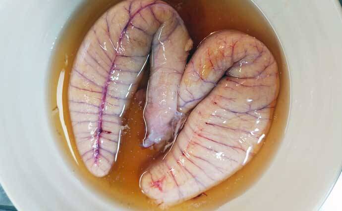 釣れたクロやヒラスズキは頭を落として、ワタを取る。この時期は白子や真子が入っているので、これらを傷つけないように取り出し、白子と真子(魚卵)に分けていく。白子は刺し身、塩焼き、てんぷらに。真子は薄皮が破れないように優しく扱い、軽く水洗いする。