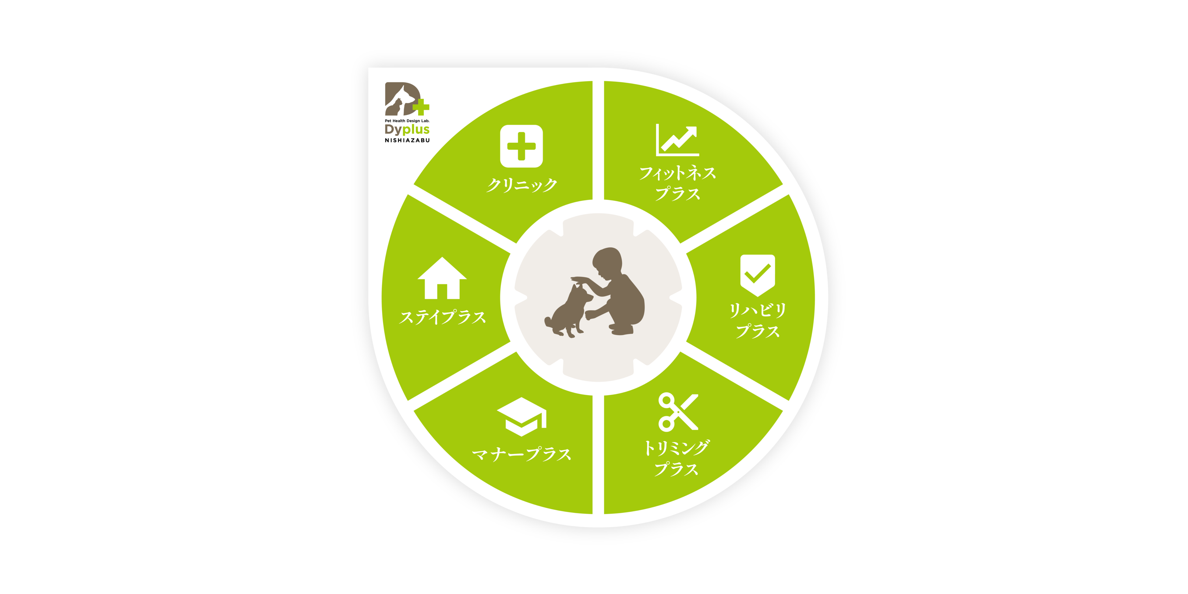Design Your Pet’s Health Plus One(ペットの健康をデザインして、プラスにする)をコンセプトに、獣医師をはじめ、理学療法士・老犬介護士・トレーナーなどのスペシャリストが連携し、Dyplus西麻布のサービスを通して、飼い主さまとペットの”ココロにプラス”をお届けいたします。