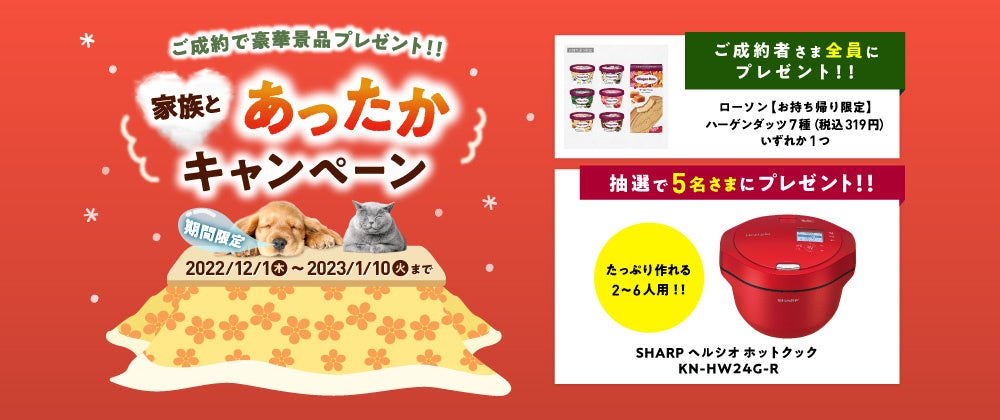 本キャンペーンは、期間中にお申込みいただいたご成約者さま全員に、ローソン店舗で引き換えできる「ハーゲンダッツ」電子クーポンをプレゼントします。さらに抽選で、人気の調理家電製品を5名様にプレゼントします。