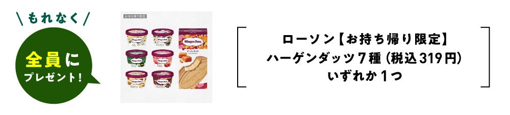| プレゼント内容 | ご成約者さま全員 ・ローソン 【お持ち帰り限定】 ハーゲンダッツ7種(税込319円)のいずれか1つ 無料引換券 ※バニラ、ストロベリー、グリーンティー、マカデミアナッツ、クリスプチップチョコレート、クッキー&クリーム、クリスピーサンド ザ・キャラメルのいずれか1つと交換可能です。 ※一部エリアや店舗ではお取り扱いのない商品がございます。対象商品が売り場にあるかを事前にご確認ください。 抽選 |