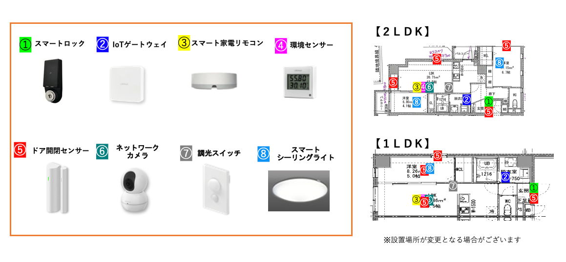 ペット共生賃貸住宅に導入された「SpaceCore」のスマートホーム機器は次の8種類となります。